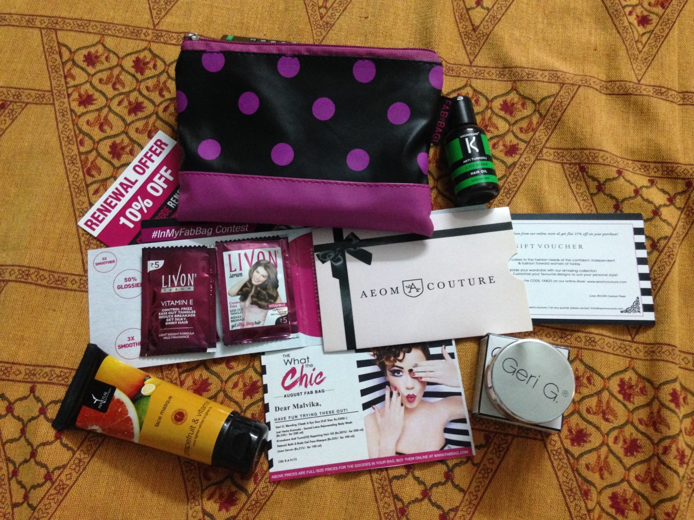 I love unwrapping gifts, especially in the month of August. It’s my birth month after all. Nice-long grey rainy days apart, the humidity that monsoons bring can be really trying, most times. So, the August compilation by Fab Bag came across as a huge relief for the dull and dreary moments